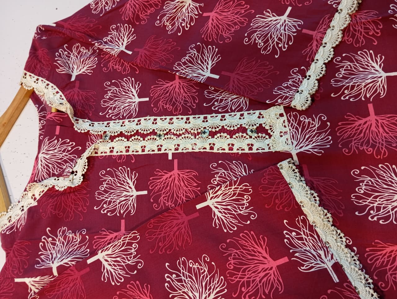 Embellishment: The neckline is decorated with a vertical strip of beautiful, intricate White/Cream Crocheted Lace, which also serves as a placket.