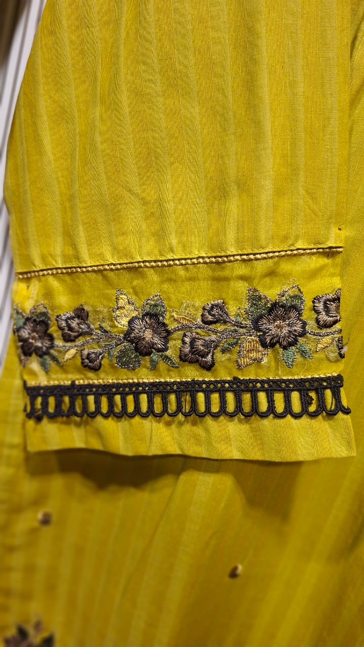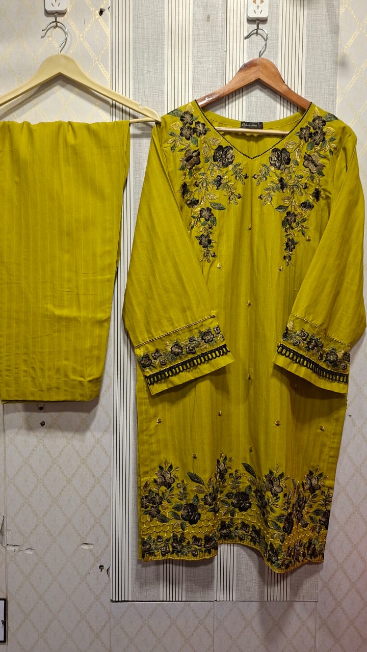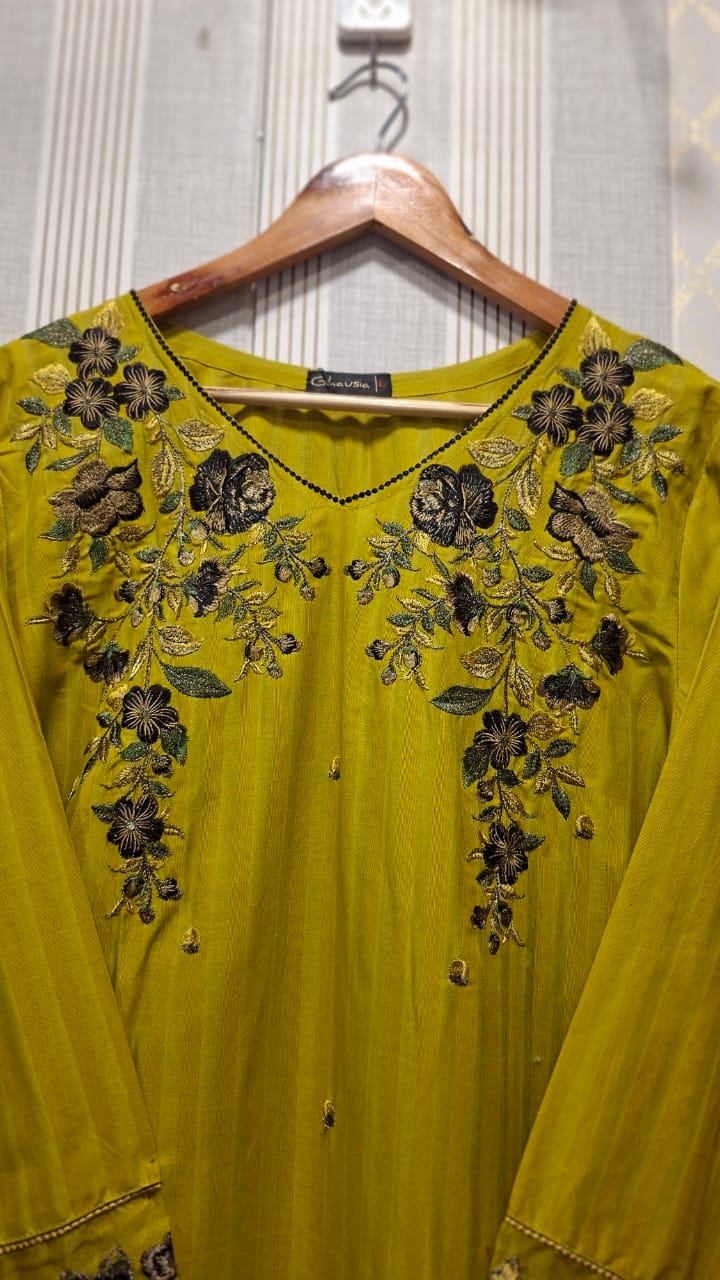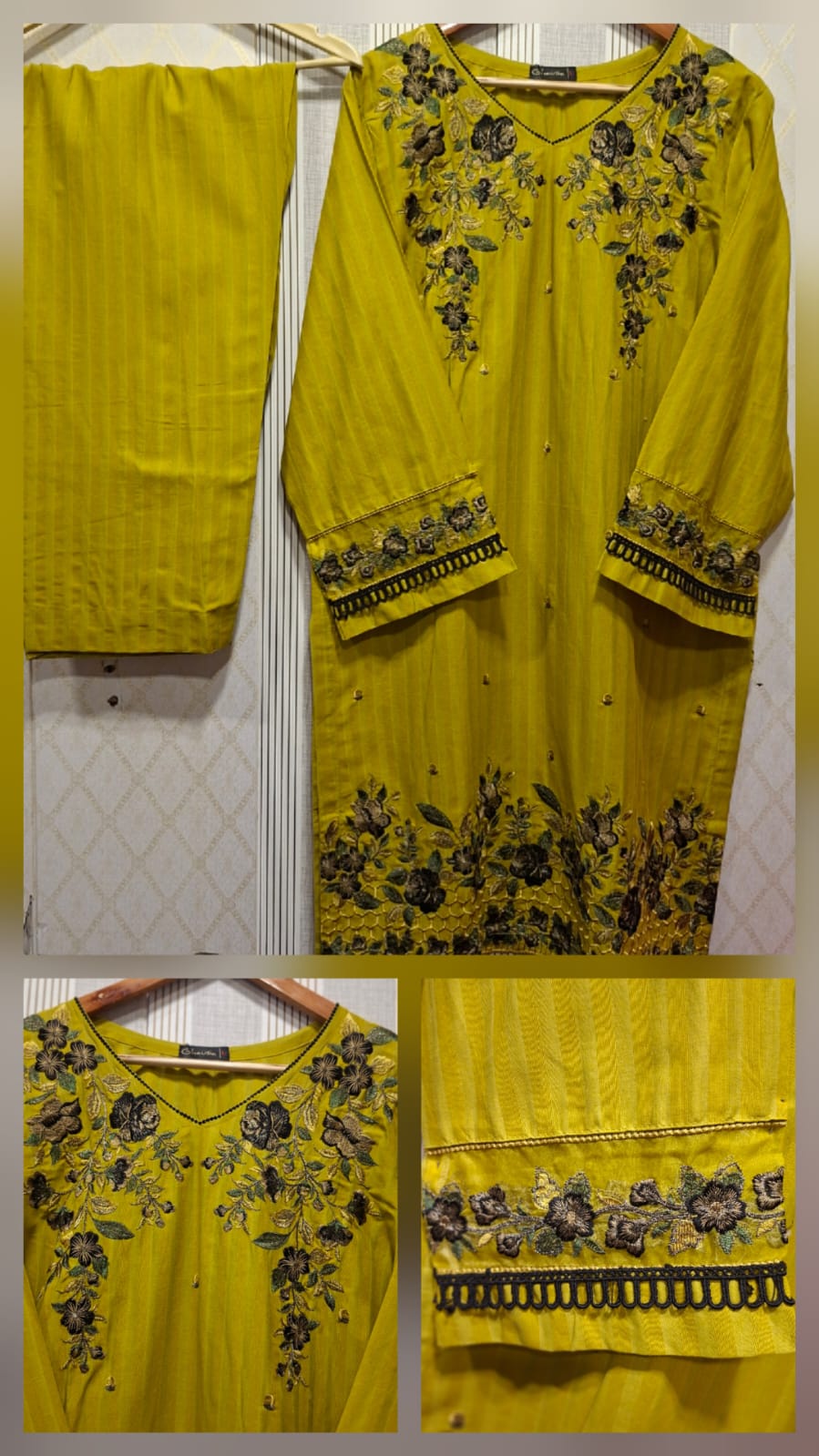 Chikankari ka Jaadoo: Gehray peelay rang ke kapray par chaandi (silver) aur halkay neelay rang ke dhaagay se bareek kashida kari ki gayi hai. Galay par V-neck design ke saath rawayati pattern aur motiyon ka kaam hai. Qameez par choti choti bootiya’n aur trouser par matching peela rang maujood hai. Yeh suit apni halki phulki saakht aur purkashish rang ki wajah se din ke waqt ki taqaareeb, doston se mulaqaat, ya daftari (Casual Office) istemaal ke liye misali hai.