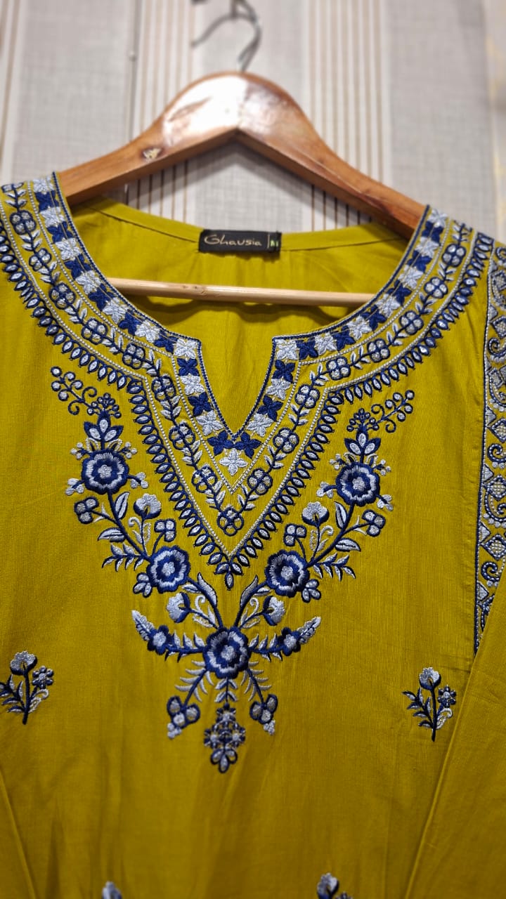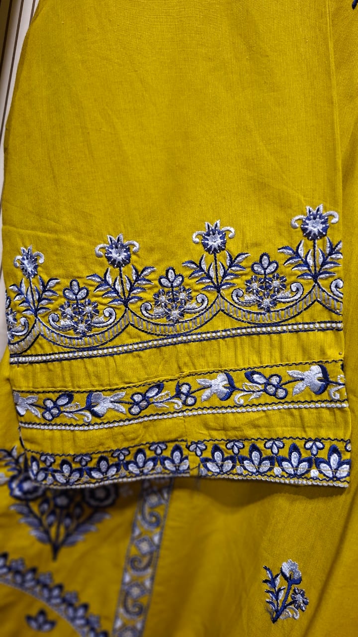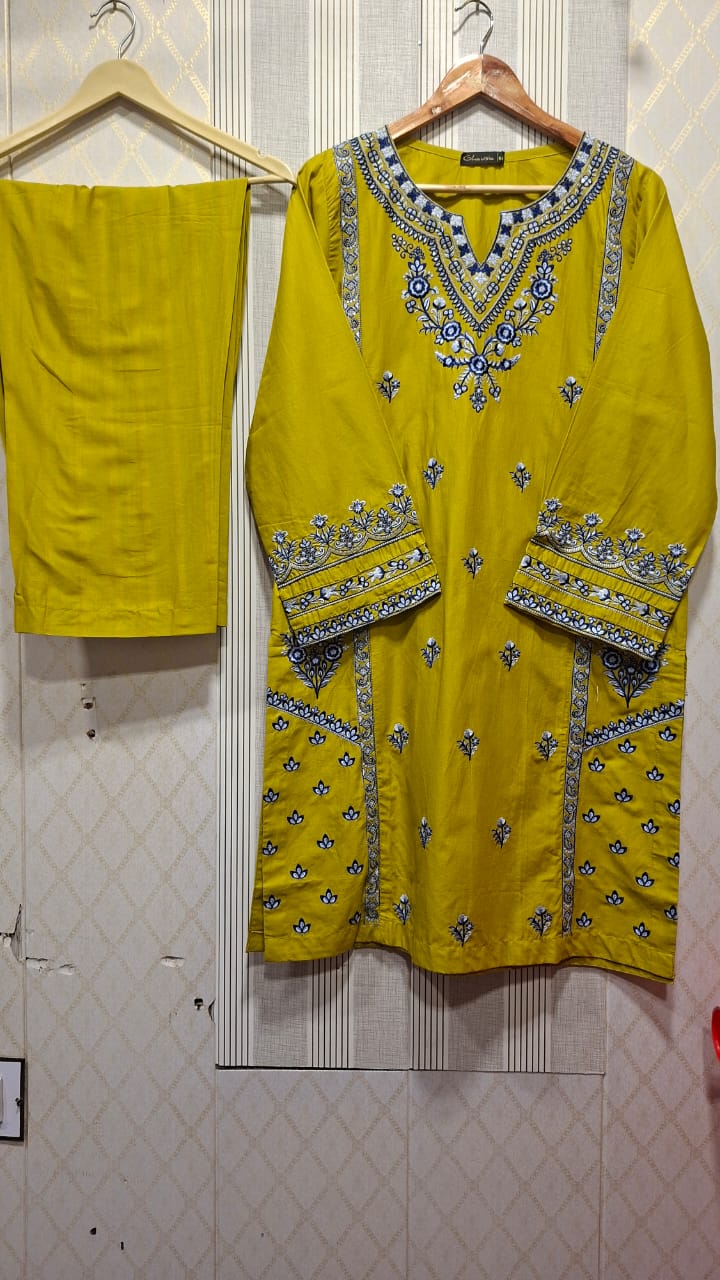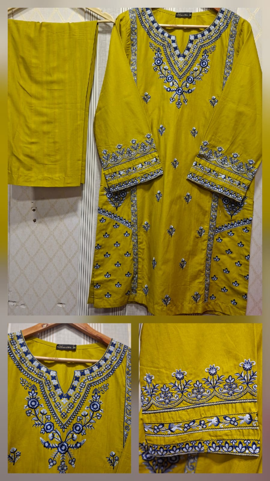 Shaandaar Banaawat: Is haldi peelay kapray ki khaas baat is ki reshmi saakht aur naazuk amoodi lineon ka design hai. Qameez par siyah dhaagay aur sunahri motiyon ki kashida kari bahut nafees hai. Is ka bhaari kaam galay ke gird aur daaman par hai, jabkay aasteenon par bhi tafseeli border maujood hai. Yeh suit shaadi biyah ki rasmon jaise ‘Mehndi’ ya ‘Mayoun’ ke liye ek behtareen intekhaab hai. Trouser bhi isi rang aur saakht mein hai, jo ek mukammal deeda-zeb look deta hai.