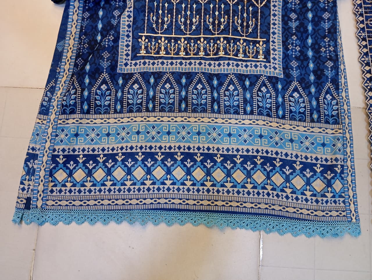 The fabric shown on the right (likely the trousers or a folded dupatta) features a lighter base with small, dark blue geometric motifs.