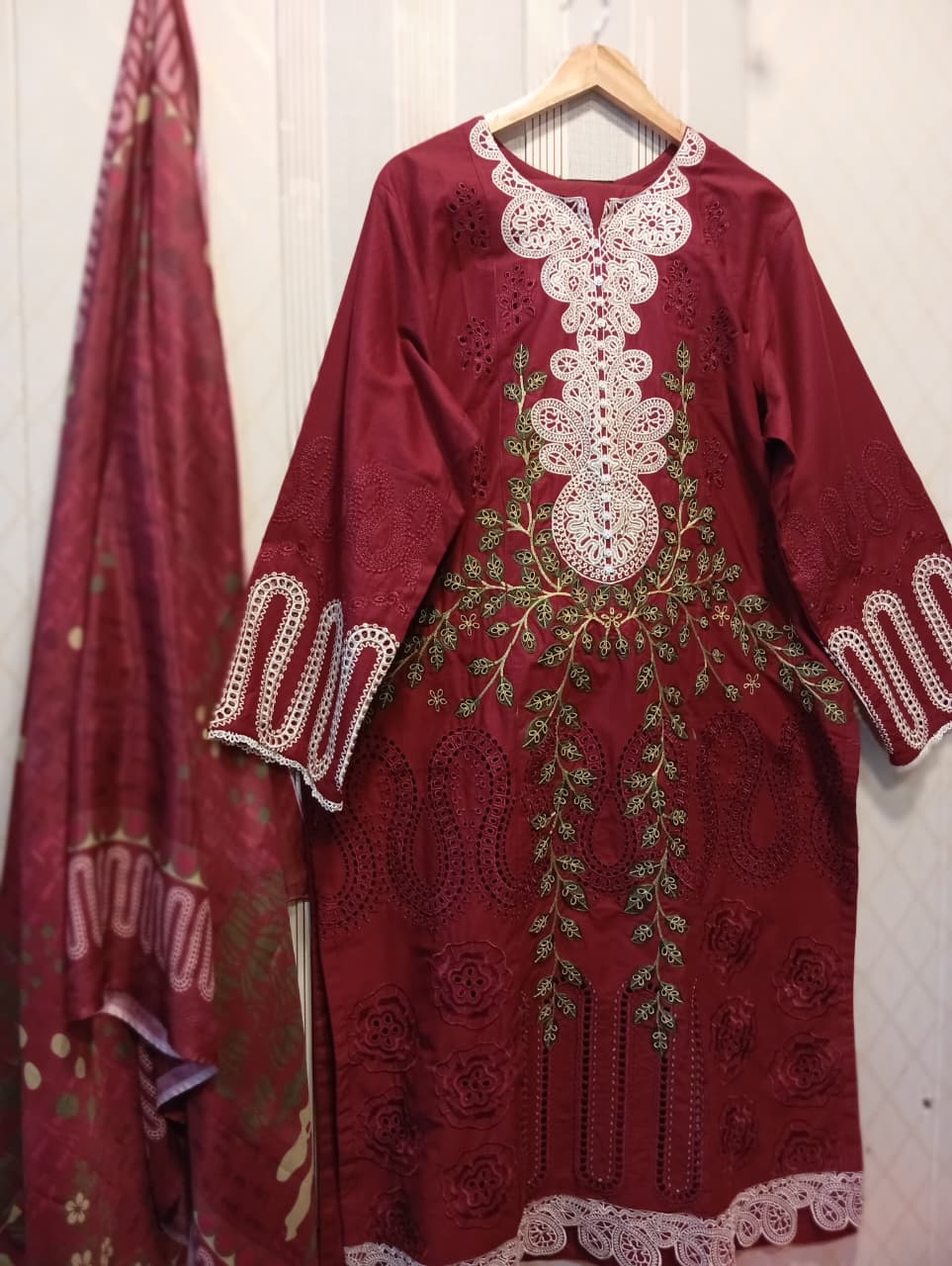 1. Color Palette The primary color is a rich Deep Maroon (Burgundy). The accents include Crisp White for the lace/embroidery and Sage Green for the delicate leaf patterns. The accompanying dupatta appears to have a gradient or printed pattern in matching shades.