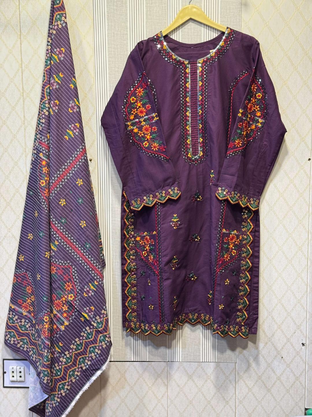 The Violet Heritage Tunic Description: Celebrate traditional craftsmanship with the Violet Heritage Tunic. This striking deep purple cotton kurti is a testament to folk artistry, adorned with vibrant, multi-coloured floral thread embroidery. The standout feature is the traditional Abla (real mirror) work beautifully interspersed within the embroidery, particularly along the neckline and cuffs, which reflect light and add a festive sparkle. The tunic features a comfortable, straight-cut silhouette, making it an ideal choice for casual festive wear, family gatherings, or an ethnic-themed brunch. Pair it with solid shalwar or straight pants to allow the rich, handcrafted details to truly shine.