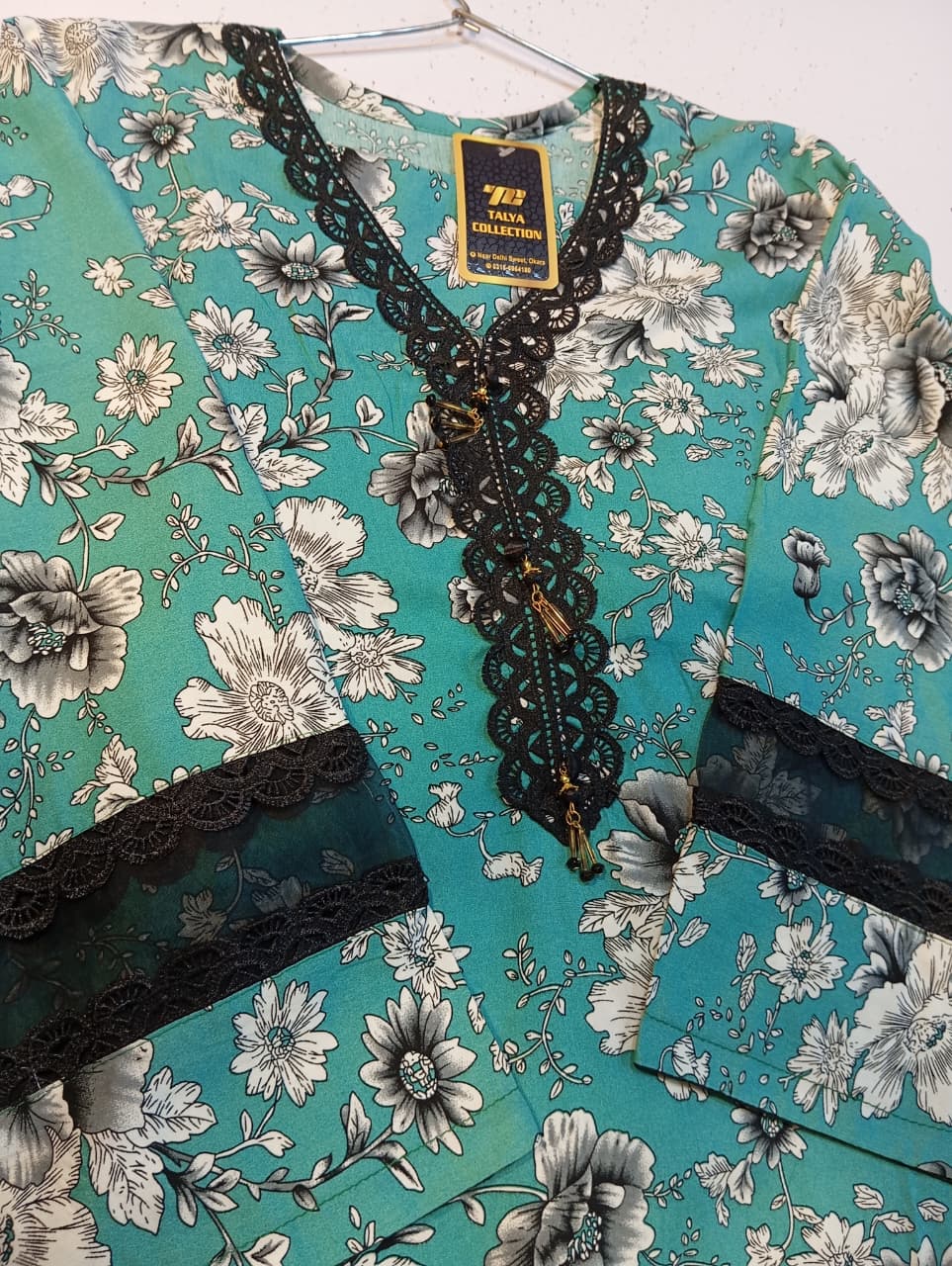 Neckline: A V-neck finished with an ornate black lace/braid trim and small decorative buttons or embellishments, possibly including a gold charm/tassel near the center.
