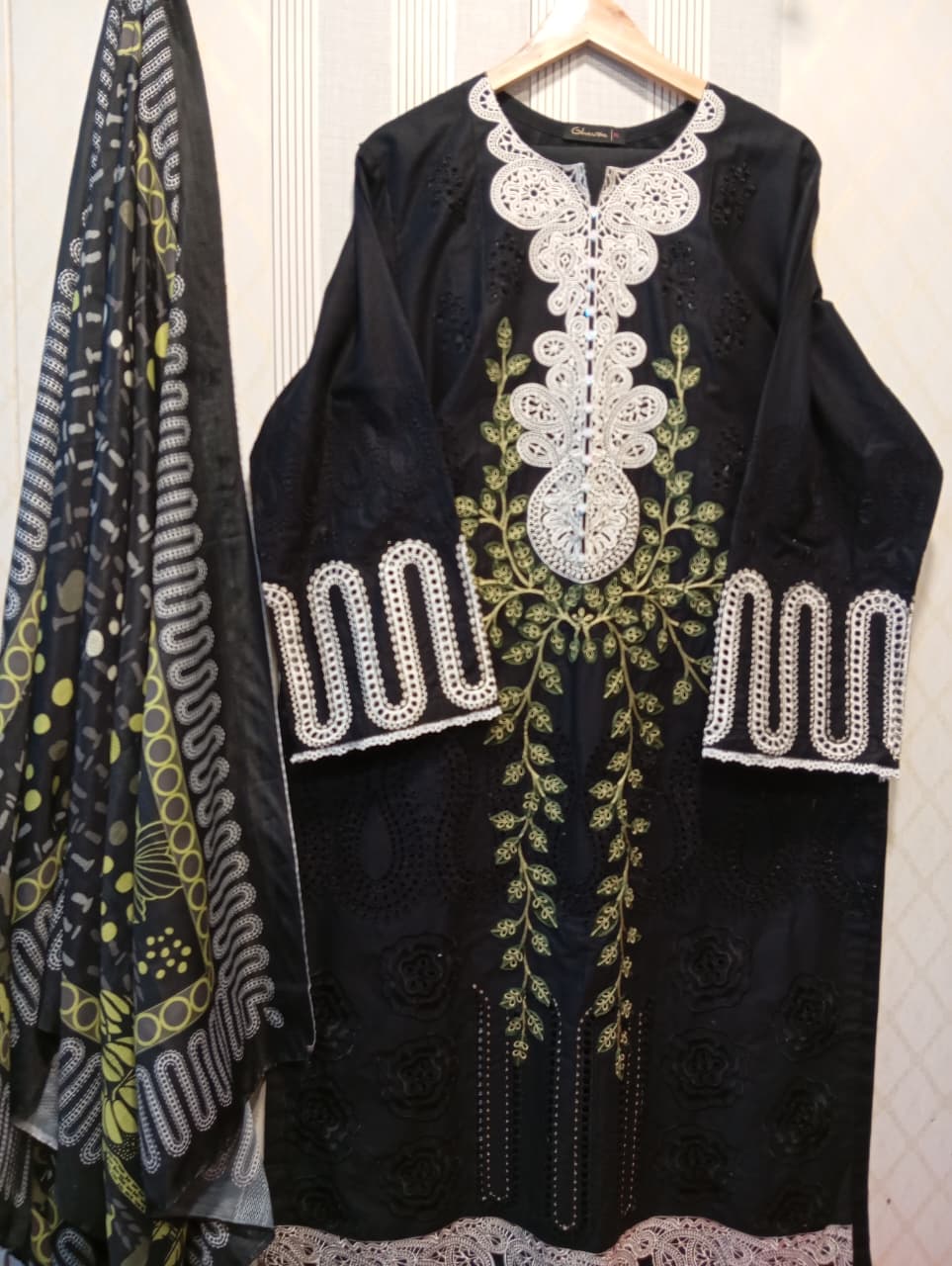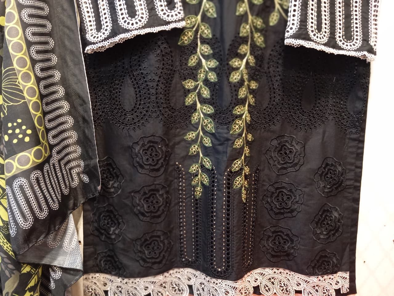 1. The Base Fabric (Jet Black) The primary color is a deep, solid black. This choice is timeless and serves as a canvas that makes the lighter embellishments “pop.” The fabric appears to have a subtle texture, possibly a lawn or cotton-silk blend, with tonal black embroidery (schiffli/bore work) on the lower panel.